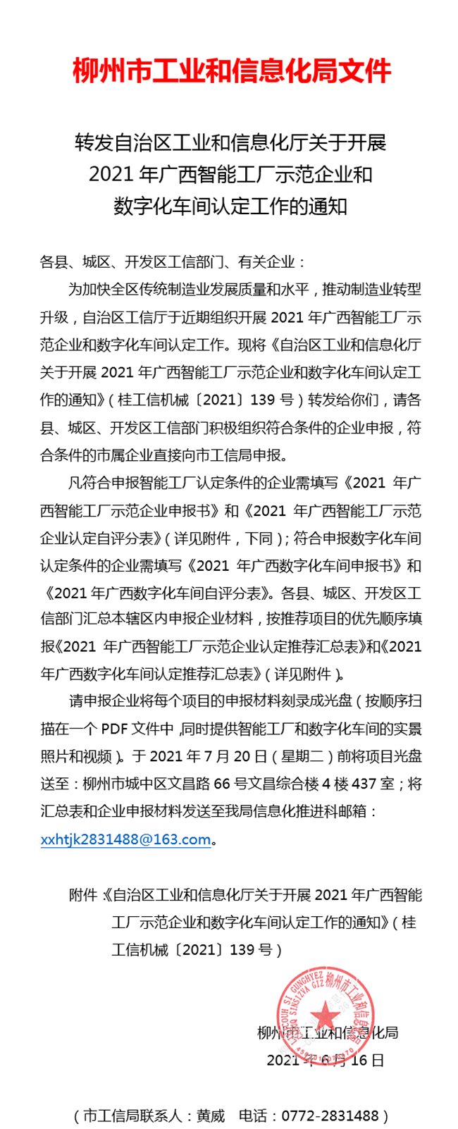 轉(zhuǎn)發(fā)自治區(qū)工業(yè)和信息化廳關(guān)于開(kāi)展2021年廣西智能工廠示范企業(yè)和數(shù)字化車間認(rèn)定工作的通知(2021-06-21)